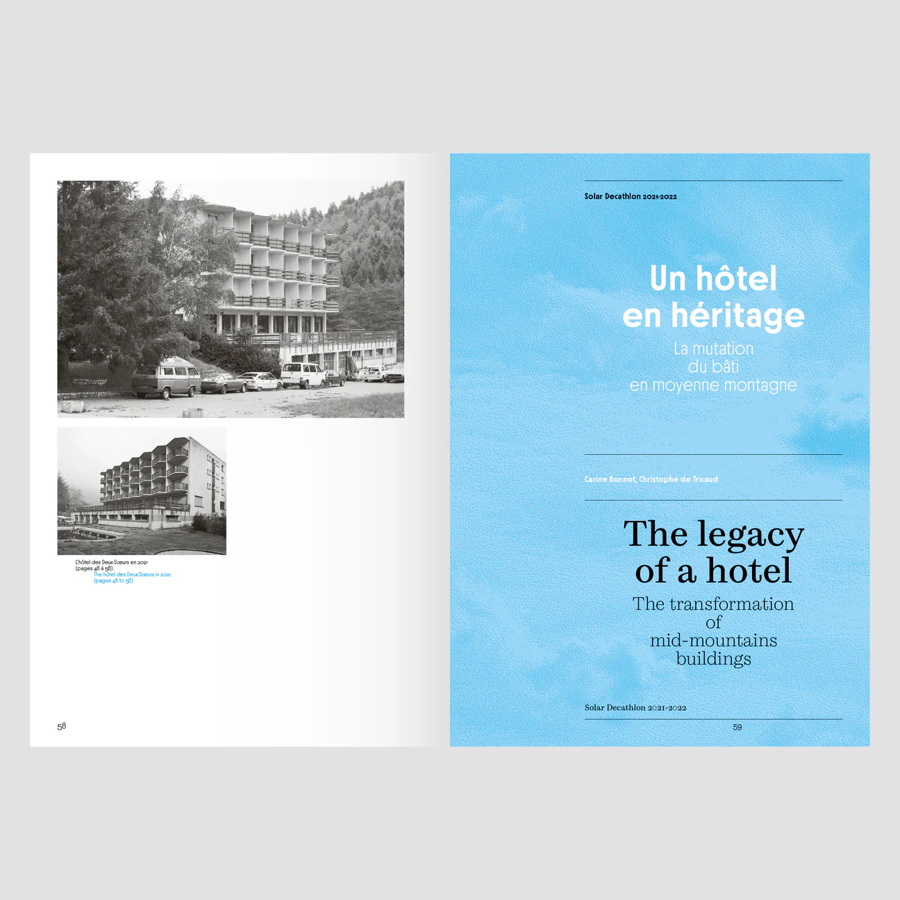 Ce livre relate une expérience simultanément pédagogique, humaine, technique et prospective. Celle de l’hôtel des Deux-Sœurs au col de l’Arzelier et de sa possible réhabilitation imaginée par une équipe engagée dans la compétition Solar Decathlon Europe 2021-2022.