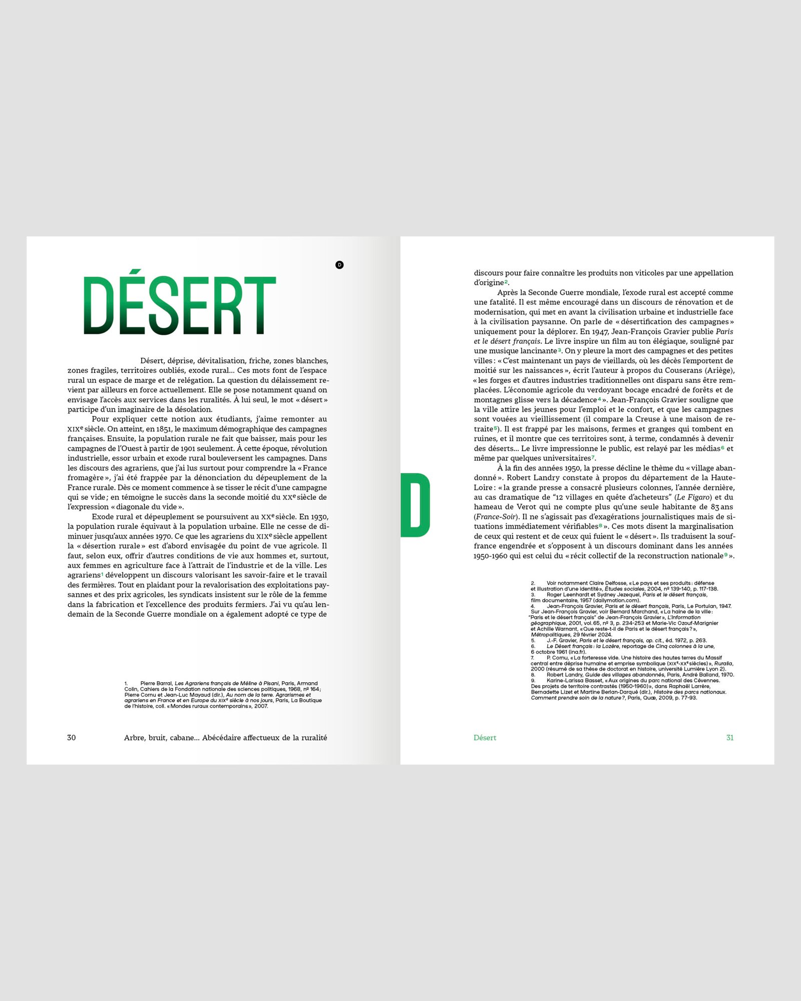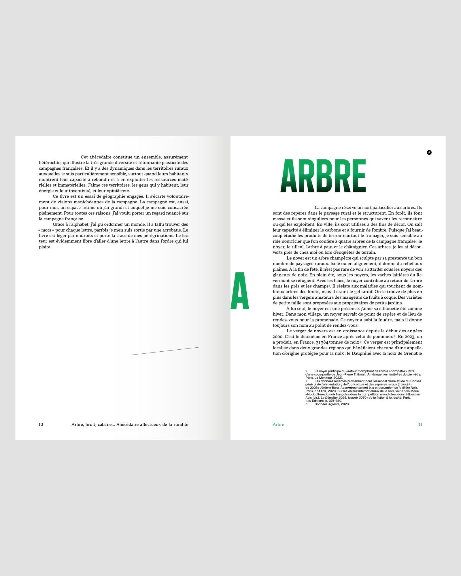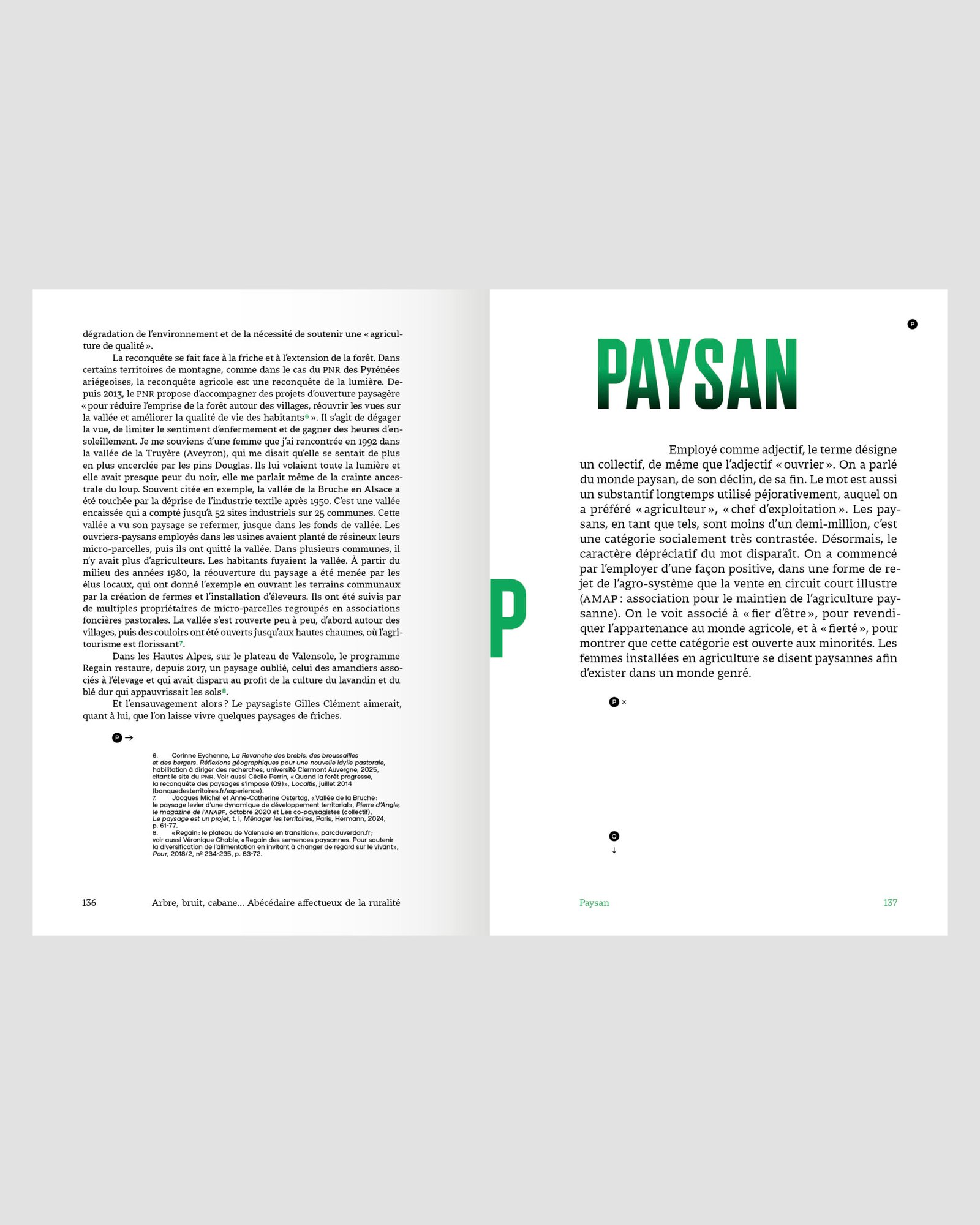 Cet abécédaire — avec ses 42 mots — raconte les objets de recherche de l’auteure: artistes, élevage, grange, itinérance, néo, soin, terroir, tiers-lieux, etc. Et qu’il est “affectueux” ce qui engage sa sensibilité: arbre, cabane, femmes, jardin, livres, etc.