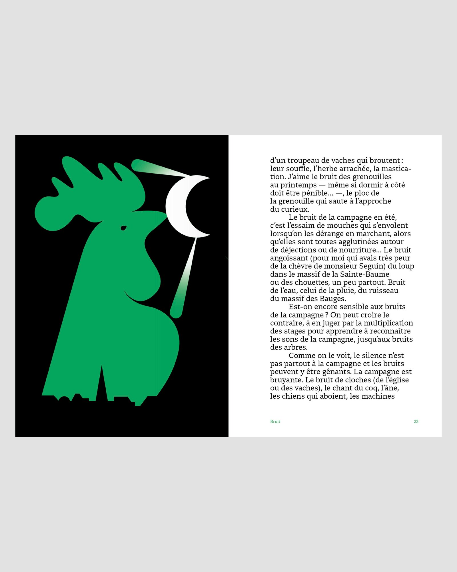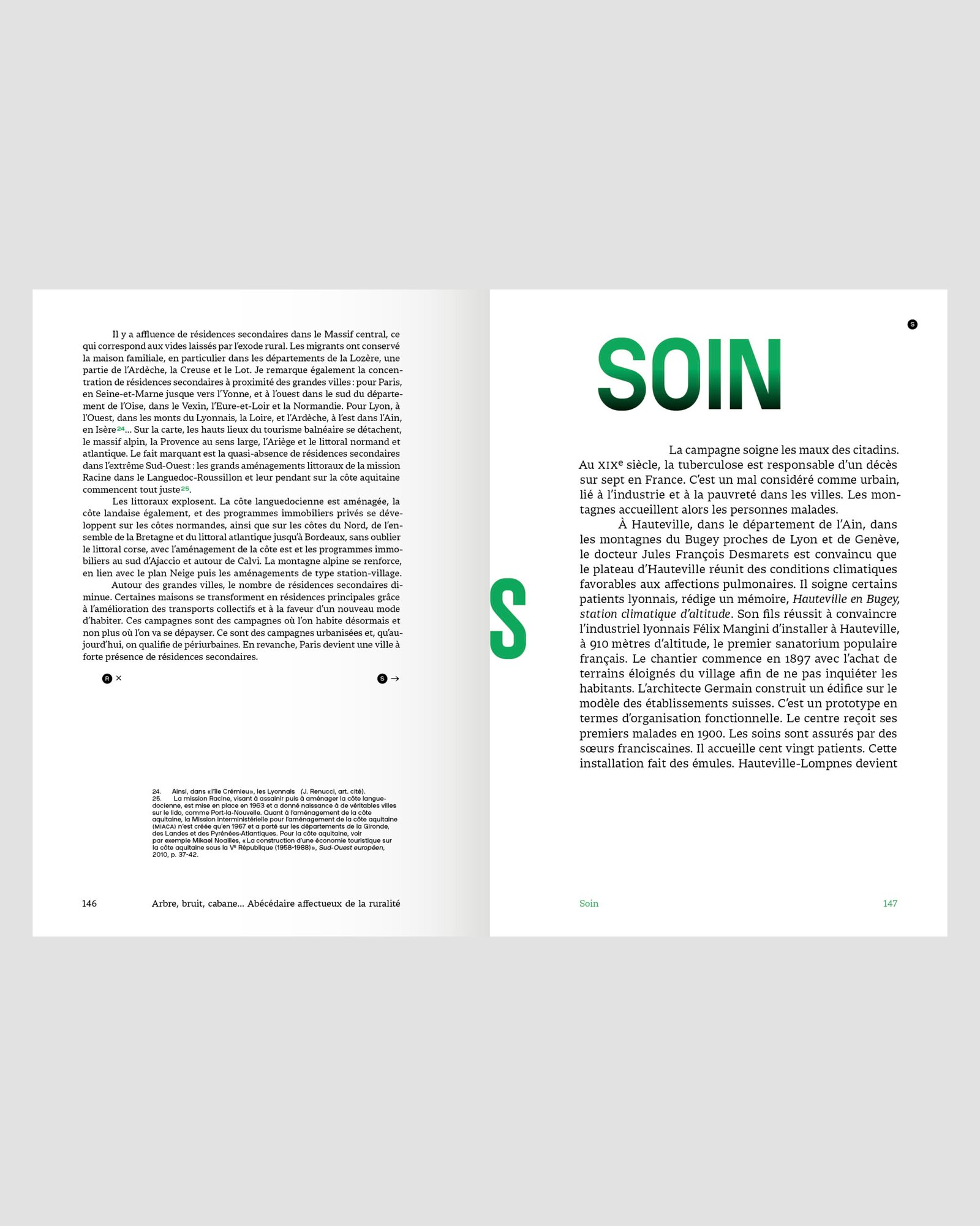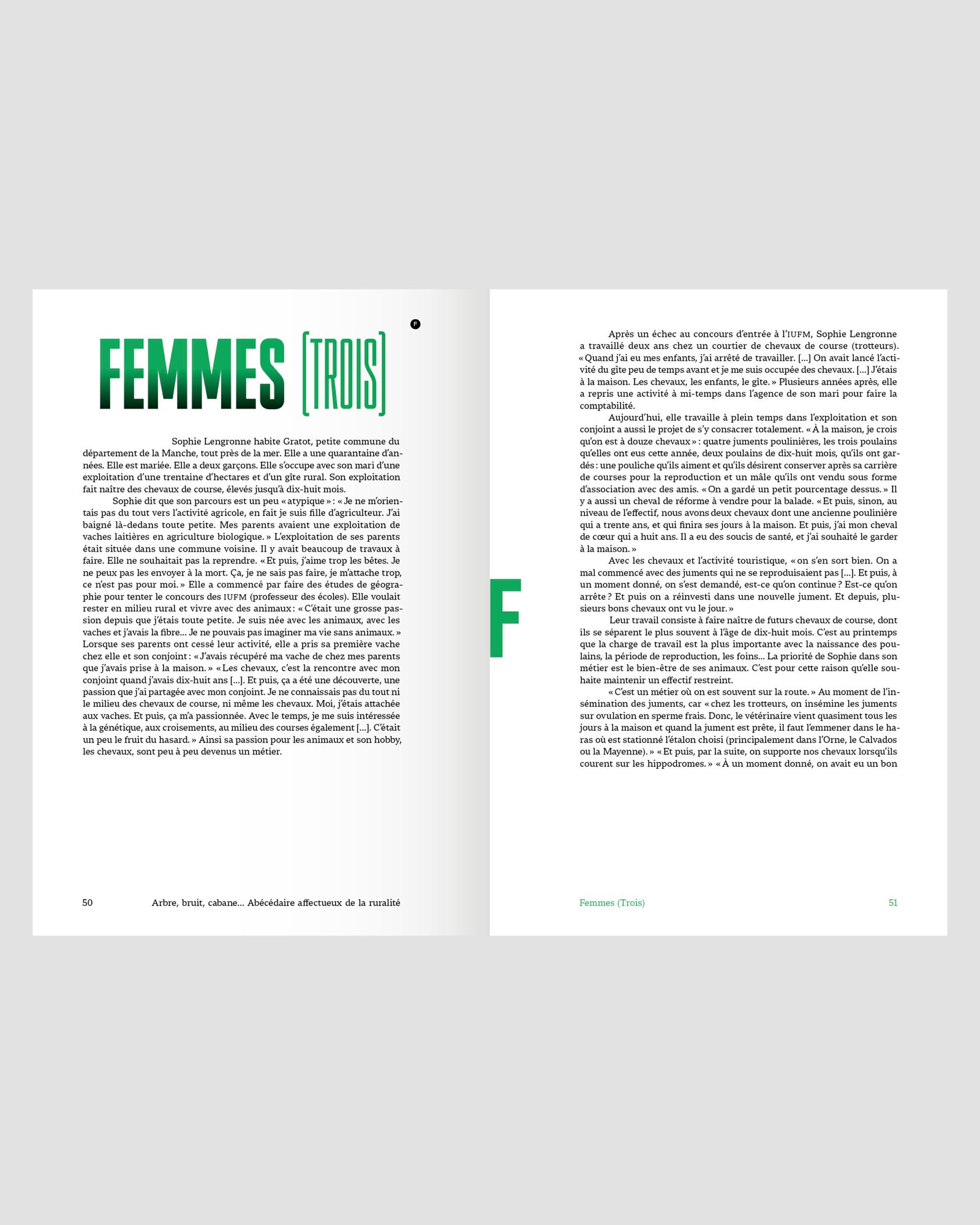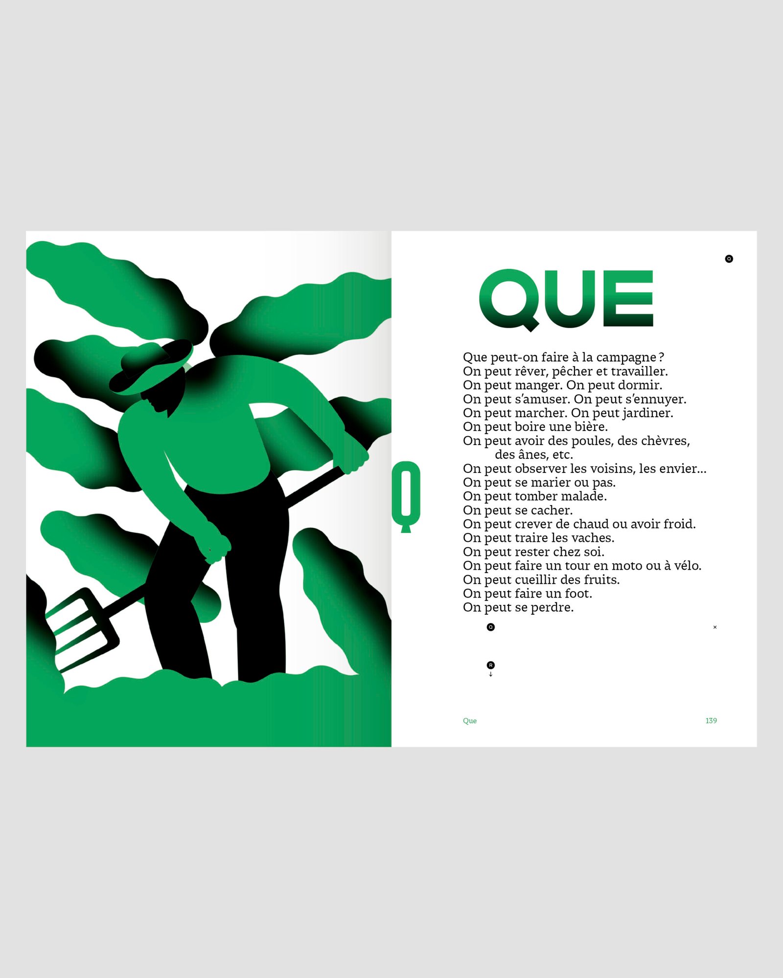 Cet abécédaire — avec ses 42 mots — raconte les objets de recherche de l’auteure: artistes, élevage, grange, itinérance, néo, soin, terroir, tiers-lieux, etc. Et qu’il est “affectueux” ce qui engage sa sensibilité: arbre, cabane, femmes, jardin, livres, etc.